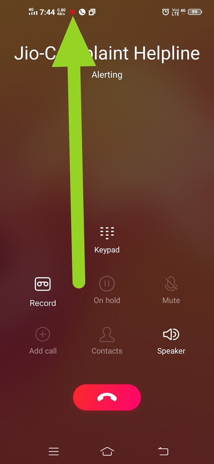 तो जैसे ही सारी चैटिंग करने के बाद app से बाहर आओगे तो उसके बाद आप किसी भी नंबर पर कॉल करोगे तो आपको ऊपर स्टेटर बार में रेड डॉट दिखेगा जिससे कि हमें पता चल जाएगा