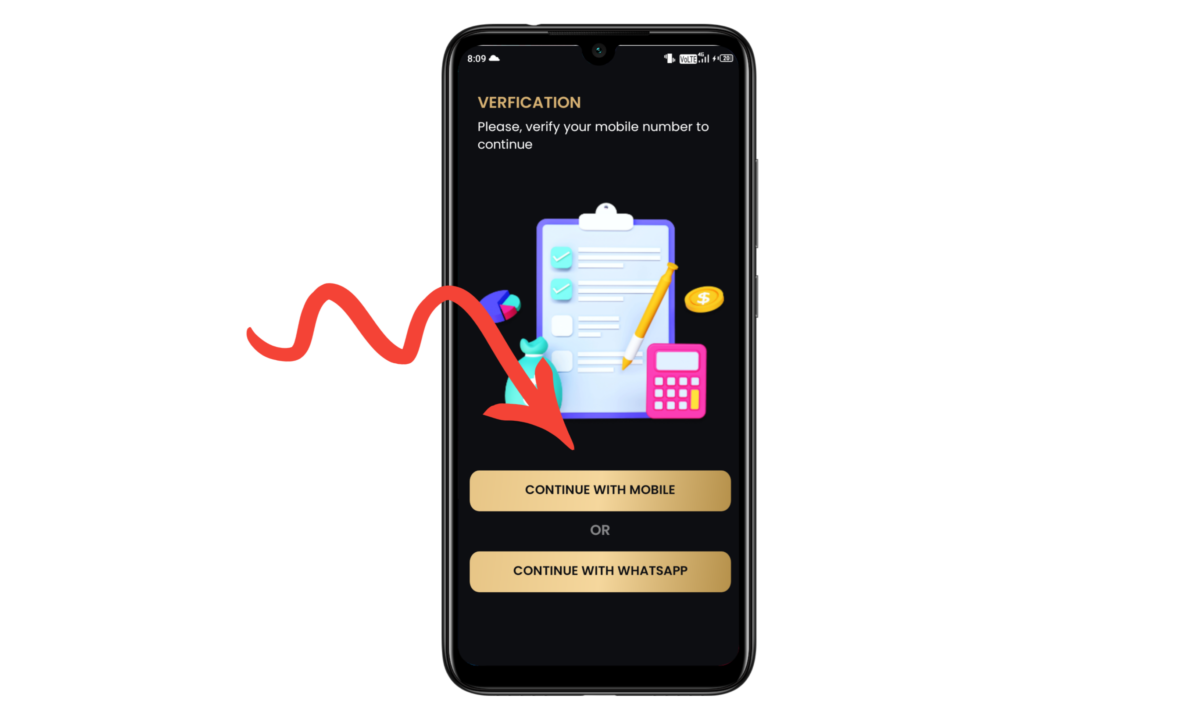 Step 3 :  Get Started बटन पर क्लिक करने के बाद तीसरा पेज ओपन होगा, अब इस एप्लीकेशन में आपको अपना अकाउंट बनाना है अकाउंट बनाने के लिए आपको दो ऑप्शन मिलेंगे, एक मोबाइल नंबर से अपना वेरिफिकेशन कंप्लीट करके अकाउंट बनाएं तथा दूसरा व्हाट्सएप एप्लीकेशन से आप वेरिफिकेशन कंप्लीट करके अकाउंट बनाएं, आसान रहेगा आप Continue With Mobile पर क्लिक करके अकाउंट बनाएं।  Continue With Mobile पर क्लिक करने के बाद आपको अपना मोबाइल नंबर लिखना है, फिर उस पर ओटीपी आएगा ओटीपी दर्ज कर देना है वह वेरिफिकेशन कंप्लीट करने के बाद आपका अकाउंट बन जाएगा।