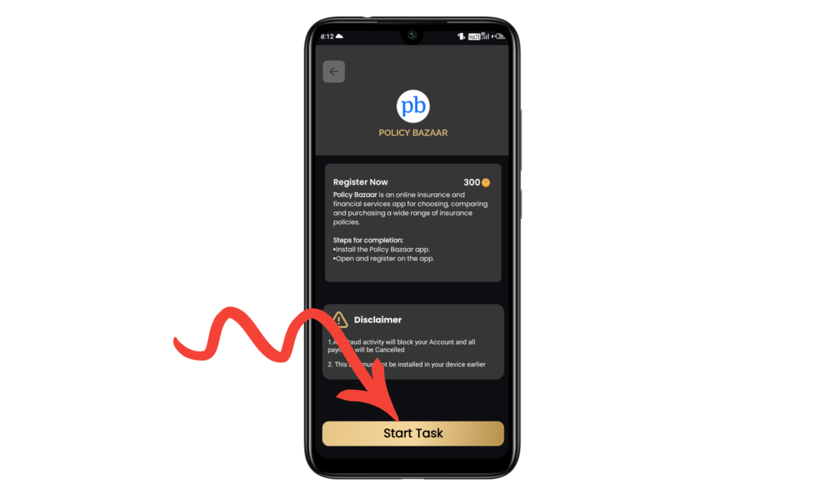 Step 5 :  Policy Bazaar पर क्लिक करने के बाद आपको नया पेज दिखाई देगा जो आप ऊपर फोटो में देख सकते हैं यहां पर आपको क्या-क्या काम करने होंगे इसके बदले में आपको पैसे मिलेंगे यहां आपको इंग्लिश में लिखा हुआ मिल जाएगा सबसे पहले आप इस पेज को पूरा आराम से पढ़ ले। इसके बाद start task पर क्लिक करें। फिर आप प्ले स्टोर पर पहुंच जाएंगे वहां पर आप पॉलिसी बाजार एप्लीकेशन को डाउनलोड करें ओपन करें उसमें अकाउंट बना ले अकाउंट बनाने के बाद आपको 300 कॉइन प्राप्त हो जाएंगे इसी तरह से आप दूसरे एप्लीकेशन को डाउनलोड करके भी coin day एप्लीकेशन से पैसे कमा सकते हैं।