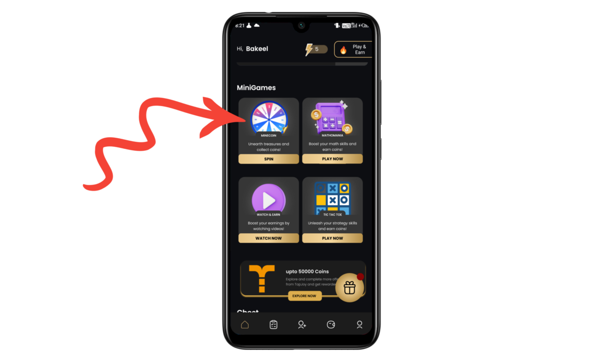 Step 6 :  Coin day एप्लीकेशन में जब आप नीचे स्क्रॉल करके आएंगे, तो आपको mini game का ऑप्शन मिलेगा इसमें आपको चार ऑप्शन पैसे कमाने के लिए मिलेंगे पहला ऑप्शन है spin, आप स्पिन करके पैसे कमा सकते हैं जैसे कि आप ऊपर फोटो में भी देख पा रहे हैं।