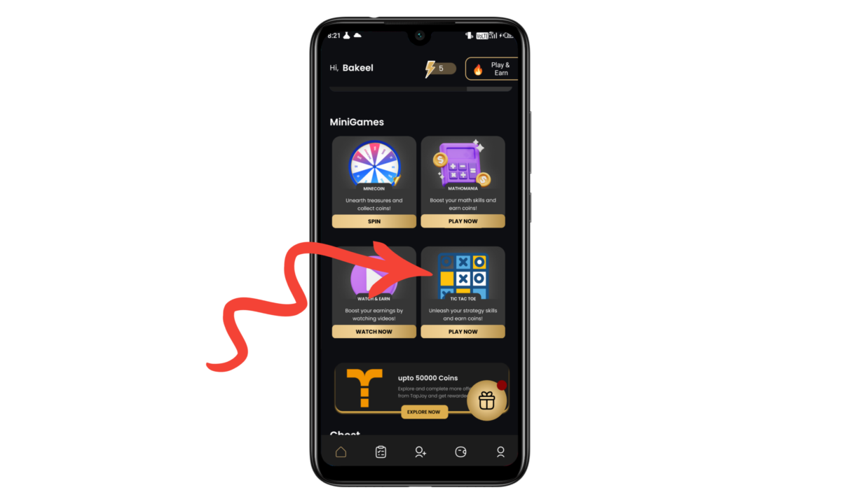 Step 9 :  चौथा ऑप्शन है, tic tac toe इससे भी आप पैसे कमा सकते हैं, बस आपको इसके ऊपर क्लिक करके ओपन करना है और जो गेम खेलने के लिए आपसे कहीं जाएं या जो गेम आपको खेलने के लिए सबसे पहले मिले उन गेमों को कंप्लीट करना है, उन टास्क को कंप्लीट करना है, उसके बाद आपको पैसे कॉइन में मिलेंगे पहले यह कॉइन आपके इसी एप्लीकेशन में वॉलेट में जुड़ते जाएंगे जब यह इकट्ठे हो जाए, उसके बाद आप अपने अकाउंट में पैसे निकाल सकते हैं, पैसे कैसे निकाला है चलिए इसके बारे में भी जान लेते हैं।