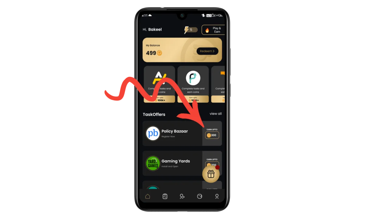 Step 4 : Coin day में अकाउंट बनाने के बाद आपको सबसे पहला पेज इस तरह से दिखाई देगा जो आप ऊपर फोटो में देख रहे हैं। यहां आने के बाद आपको बहुत सारे तरीके पैसे कमाने के मिलेंगे इसके बारे में हम आगे बात करने वाले हैं। इस एप्लीकेशन में सबसे आसान तरीका है task offers को कंप्लीट करके पैसे कमाने का, यहां आपको जो एप्लीकेशन दिए गए हैं उनको डाउनलोड करना है उसमें अकाउंट बनाना है और आपके कॉन प्राप्त होंगे जिसको आप अकाउंट में पैसे में बदलकर निकाल सकते हैं। एक मैं आपको डाउनलोड करके भी दिखा देता हूं जैसे की policy bazaar एप्लीकेशन दिख रहा है डाउनलोड करने के लिए इसके आगे coin पर क्लिक करना है।
